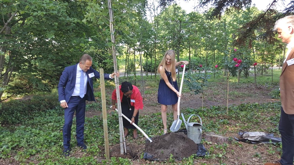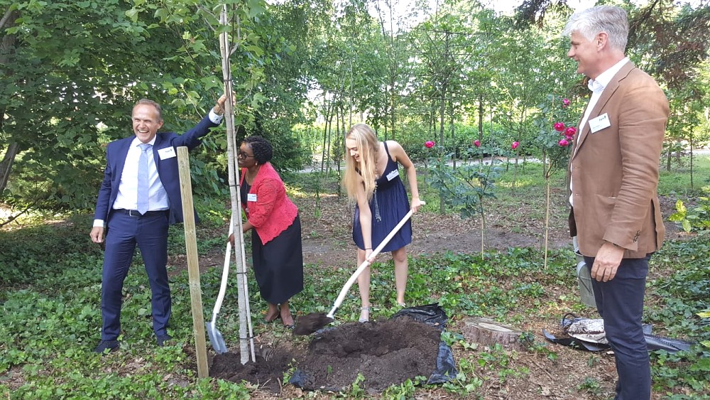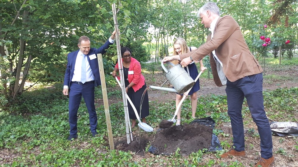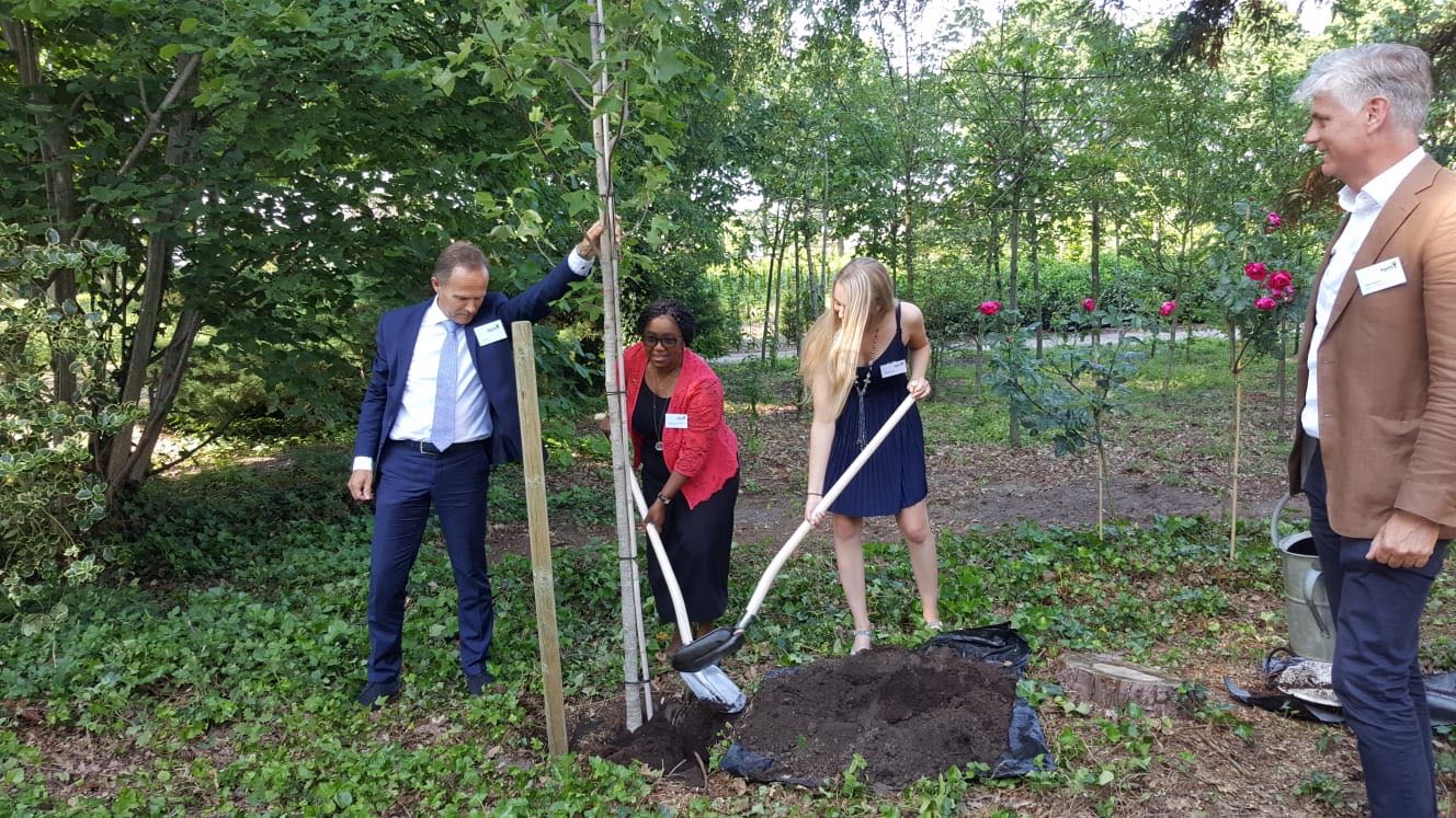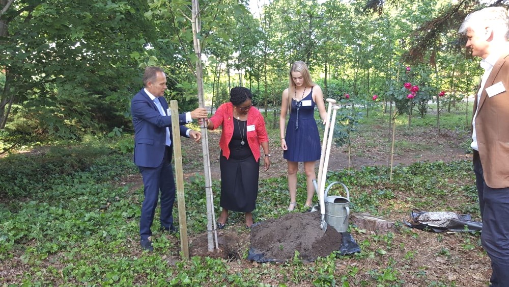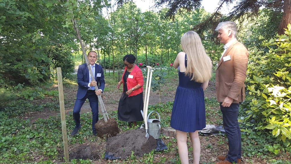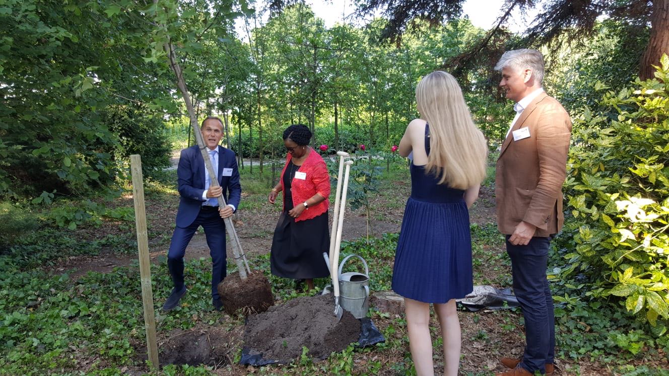 The Ambassador participated in a Symposium which culminated in the planting of a tree to celebrate 25 years of the establishment of Form International (FI) and the inauguration of FI’s new office in Hattem on the 6th of June 2018. FI and the Dutch Government have been extending support to Tanzania in the forestry development sector since 2013. Included in the pictures below: CEO of FI, Mr. Paul Hol (in the blue suit) and his daughter, Isabel, as well as Ambassador Hans Docter, Director for Sustainable Economic Growth in the Dutch Ministry of Foreign Affairs (in the brown jacket). All took part in the planting of the tree.