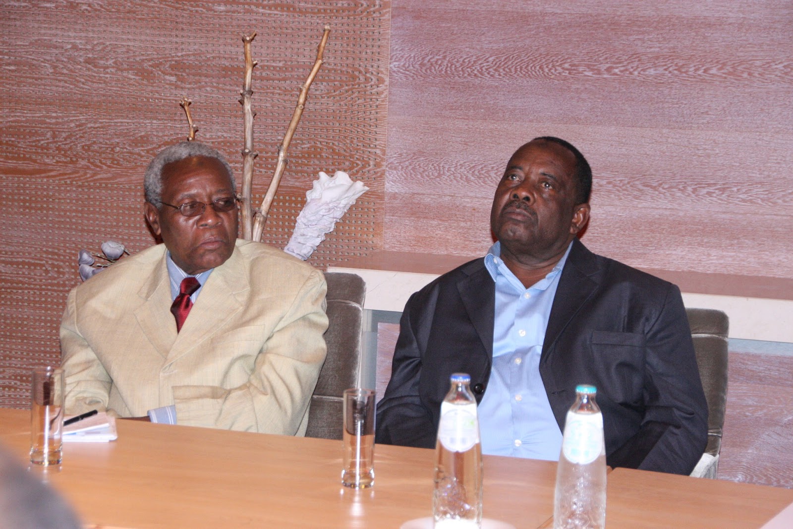 Balozi Mohamed Ramia Abdiwawa (kushoto) na Waziri wa Ardhi, Maji, Makaazi na Nishati Ramadhan Abdalla Shaaban,wakiwa katika mazungumzo ya Rais wa Zanzibar na Mwenyekiti wa Baraza la Mapinduzi Dk.Ali Mohamed Shein,na Watanzania wanaishi Nchini Uholanzi,akiwa katika ziara ya kiserikali katika ukumbi wa Hilton Hotel Mjini The Hague.